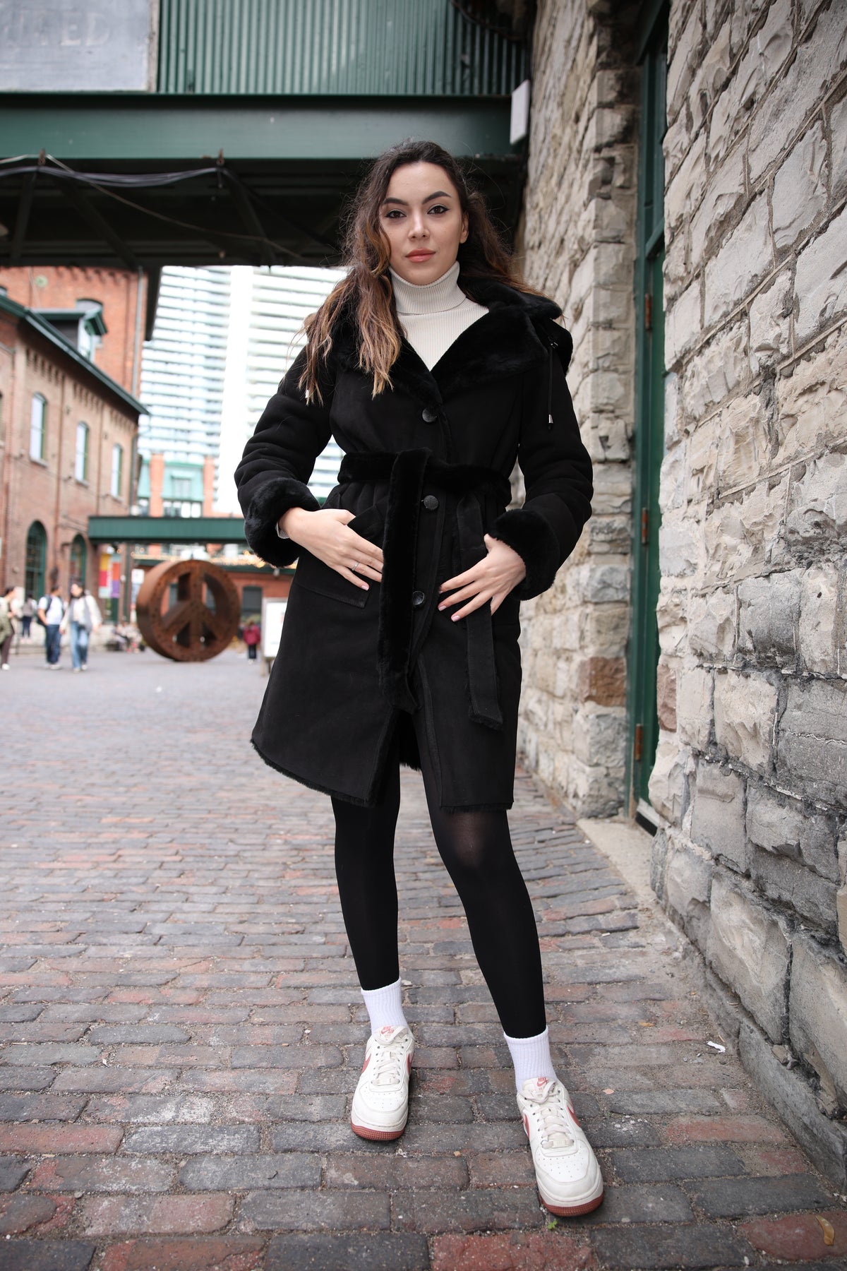Elevate your winter ensemble with the Melissa Black suede shearling coat, a fusion of sophistication and comfort. Crafted from sumptuously soft suede and lined with plush shearling, this coat offers unparalleled warmth and luxury. The addition of a sleek belt cinches the waist, accentuating your silhouette with effortless grace. With its timeless black hue and exquisite craftsmanship, the Melissa coat is the epitome of refined elegance, ensuring you stay cozy and chic throughout the season.