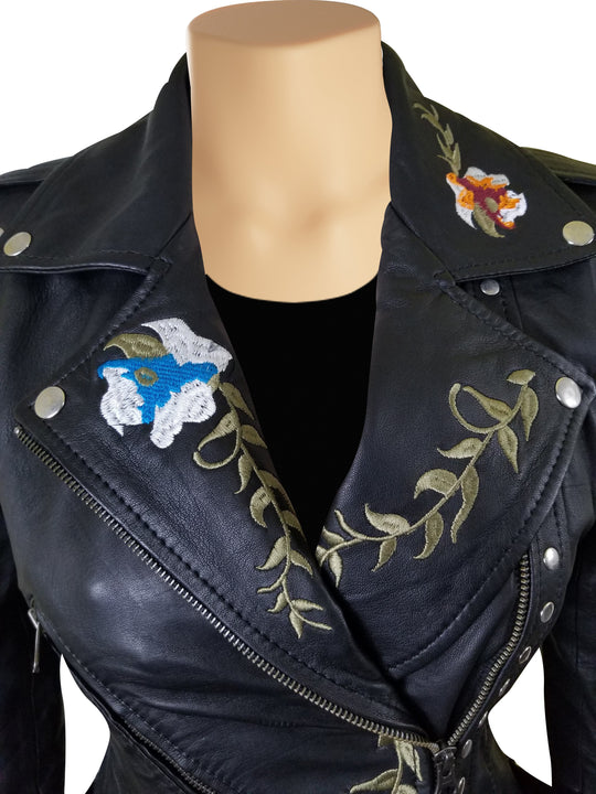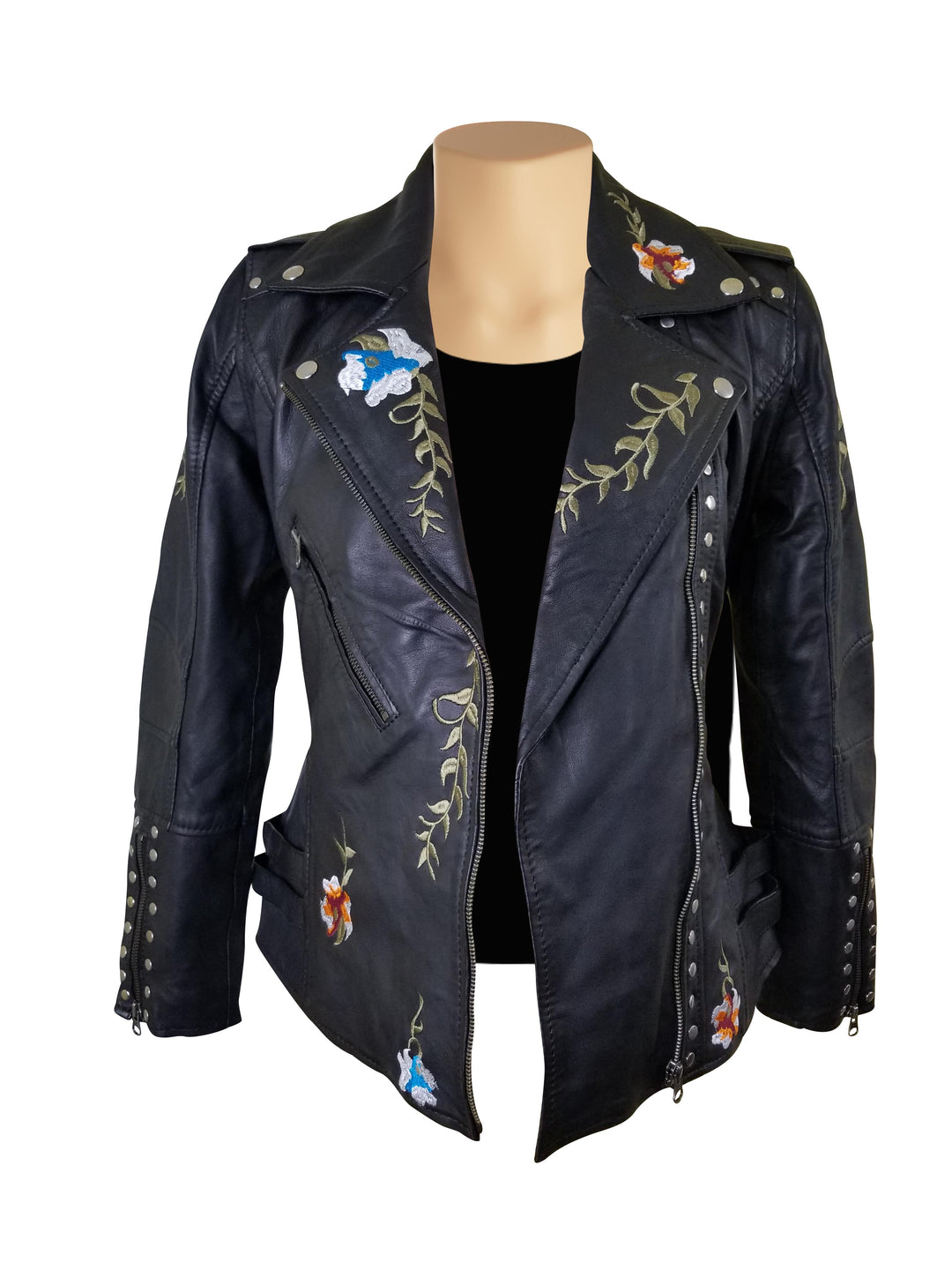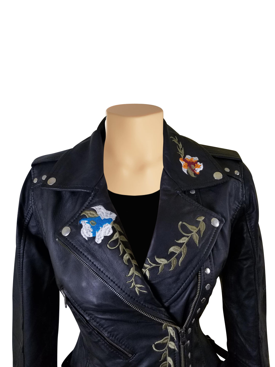 The classy-looking Flowery Embroidered Leather Jacket with studs definitely has an elegant appearance. The whole top-to-the-bottom look of this leather jacket screams fashion. The beautiful stud detailing on the front, back, and cuffs make it more desirable to wear. The external side of this jacket is manufactured using premium quality full-grain leather material. On the internal side of this jacket, there is a lining of smooth and soft satin polyester attached that keeps you warm and comfy all the time. There is a side zipper attached to the front side for the closure. The jacket has a studded notch lapel-style collar with press studs too that gives a lavish look.