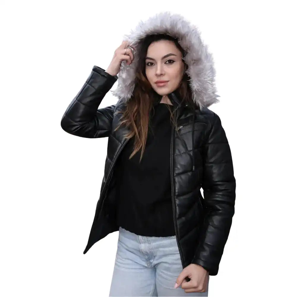 Snow’s Hooded Winter Leather Puffer Jacket